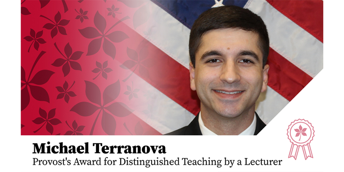 Lieutenant Michael Terranova is a recipient of the Provost's Award for Distinguished Teaching by a Lecturer — the university's highest teaching recognition. This accolade annually recognizes a maximum of six lecturers, senior lecturers or other associated faculty members for their teaching excellence. A committee of students, faculty and alumni select the award recipients.